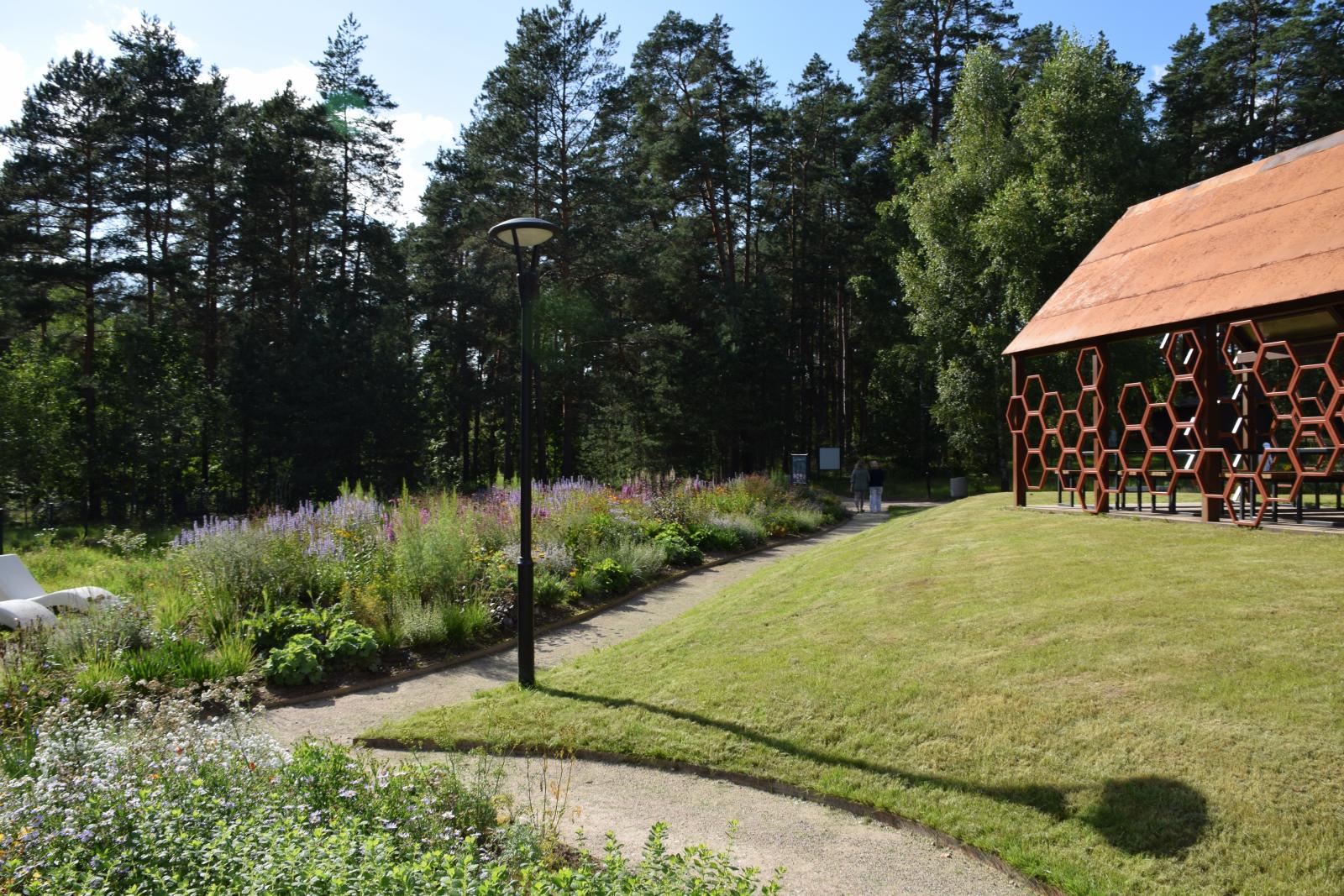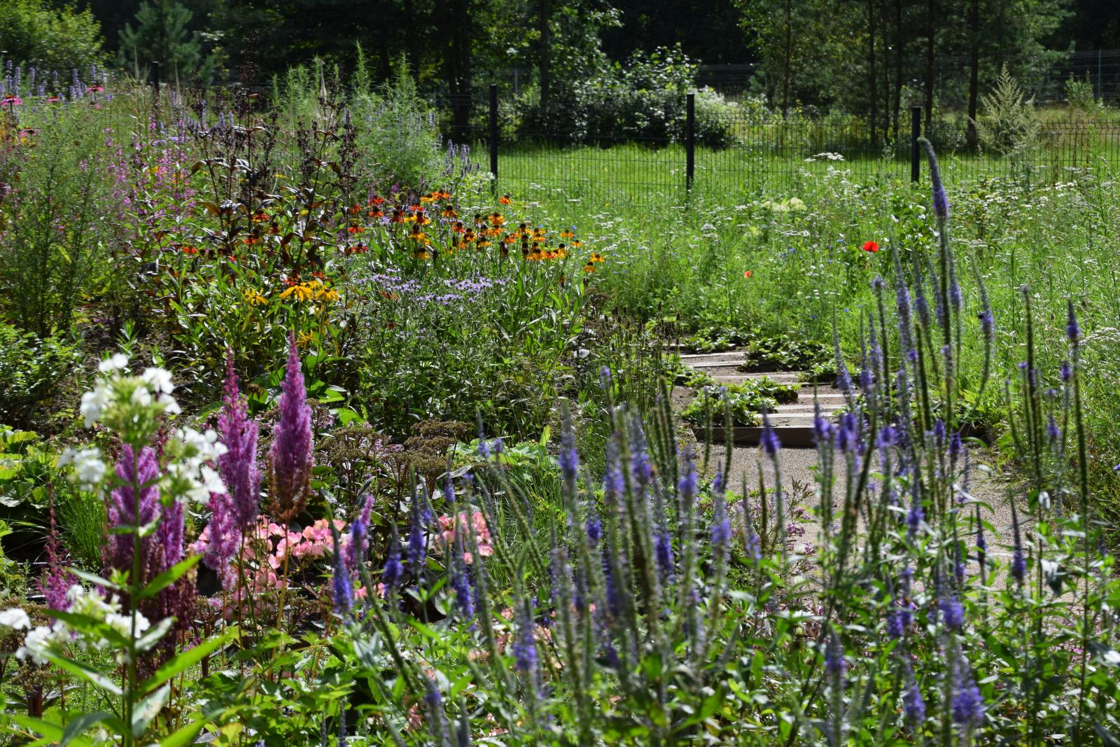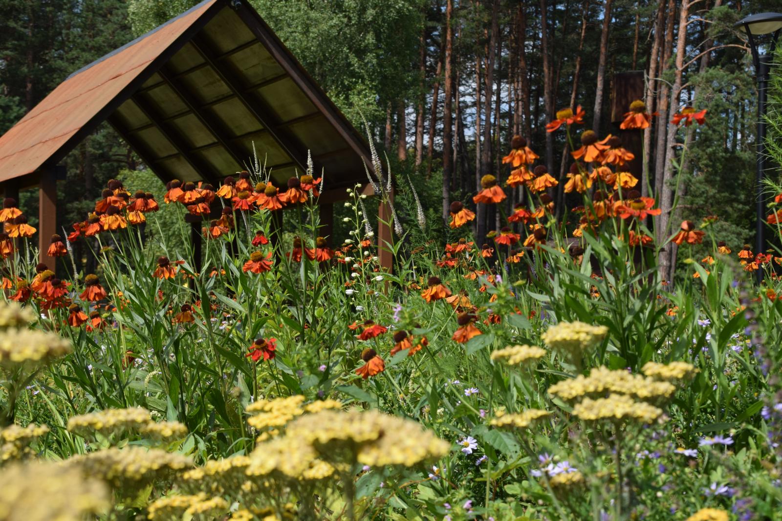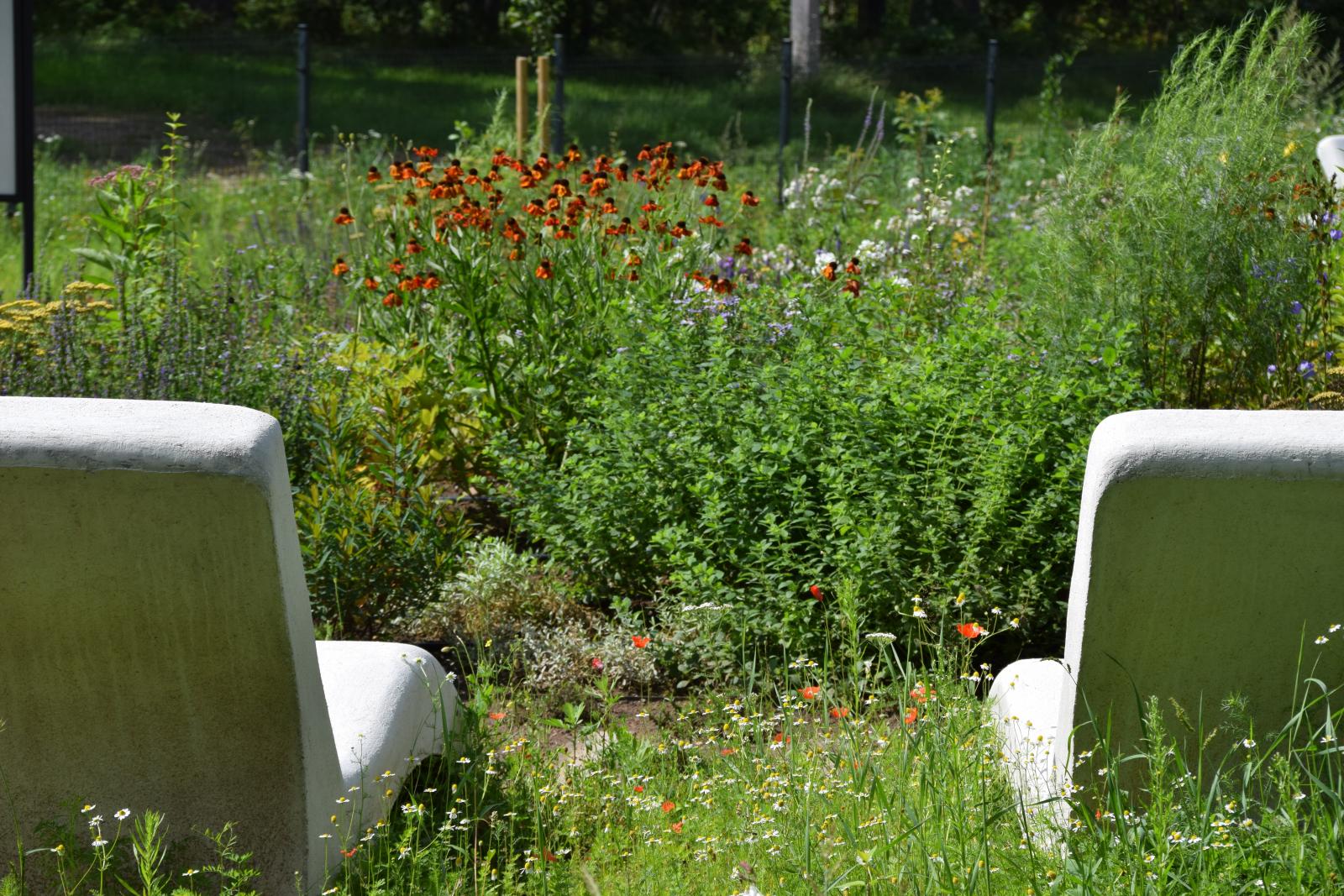 Teritorijos pakraščiuose pasėta 10,5 aro užimanti žydinti pieva, iliustruojanti kaip tvariai ir šiuolaikiškai galima apželdinti didesnių plotų teritorijas, tiek mieste, tie kir užmiesčio sodybose. Šis būdas yra tvarus ir tausojantis gamtą, leidžiantis kurtis naujoms ir plėstis esamoms vabzdžių, augalų, gyvūnų bei mikroorganizmų bendrijoms.